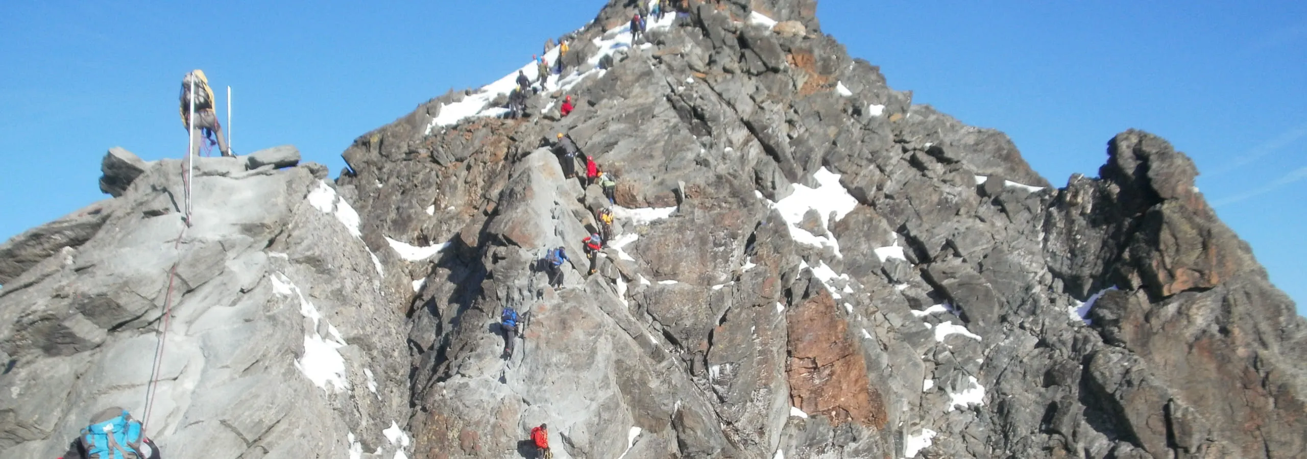 - Trittsicherheit und Schwindelfreiheit im weglosen, fels- und eisdurchsetzten Gelände (wechselnde Passagen mit Steigeisen auf Eis und Fels im 2. Schwierigkeitsgrad)